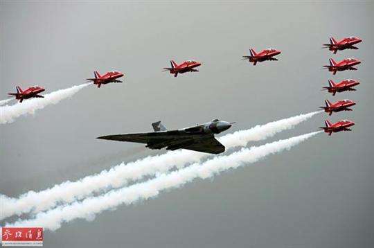 7月9日,在英國南部小城范堡羅,英國紅箭飛行隊和一架火神轟炸機(jī)在范堡羅航展上進(jìn)行開幕表演。來源:參考消息
