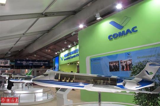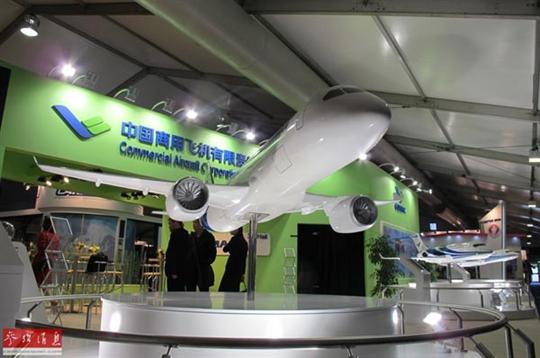 中國商用飛機(jī)有限責(zé)任公司攜C919大型客機(jī)模型、ARJ21-700新支線飛機(jī)模型參加范堡羅國際航空展。來源:參考消息