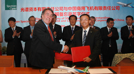 中國經(jīng)濟(jì)網(wǎng)訊 2012年7月10日,范堡羅航展第二天,中國商飛公司與光譜資本有限責(zé)任公司(以下簡稱光譜公司)在英國倫敦簽署諒解備忘錄。
