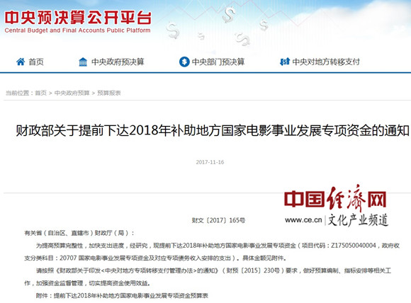 財政部關(guān)于提前下達(dá)2018年補(bǔ)助地方國家電影事業(yè)發(fā)展專項(xiàng)資金的通知