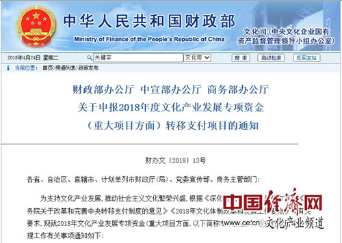 通知說明,為支持文化產(chǎn)業(yè)發(fā)展,推動社會主義文化繁榮興盛,根據(jù)《深化財稅體制改革總體方案》《國務(wù)院關(guān)于改革和完善中央轉(zhuǎn)移支付制度的意見》《2018年文化體制改革和發(fā)展工作要點》等有關(guān)要求,財政部、中宣部和商務(wù)部聯(lián)合管理2018年文化產(chǎn)業(yè)發(fā)展專項資金(重大項目方面,以下簡稱專項資金)轉(zhuǎn)移支付項目申報工作。
