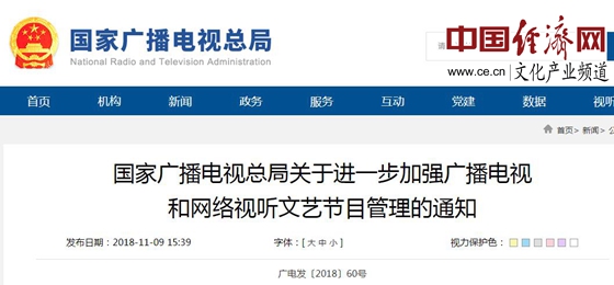 經(jīng)濟(jì)日?qǐng)?bào)-中國(guó)經(jīng)濟(jì)網(wǎng)北京11月20日訊 日前,國(guó)家廣播電視總局發(fā)布了《關(guān)于進(jìn)一步加強(qiáng)廣播電視和網(wǎng)絡(luò)視聽(tīng)文藝節(jié)目管理的通知》(以下簡(jiǎn)稱(chēng)“通知”)。《通知》指出,一些文藝節(jié)目出現(xiàn)了影視明星過(guò)多、追星炒星、泛娛樂(lè)化、高價(jià)片酬、收視率(點(diǎn)擊率)造假等問(wèn)題,不僅推高制作成本、破壞行業(yè)秩序生態(tài),而且誤導(dǎo)青少年盲目追星,滋長(zhǎng)拜金主義、一夜成名等錯(cuò)誤價(jià)值觀念,必須采取有效措施切實(shí)加以糾正。