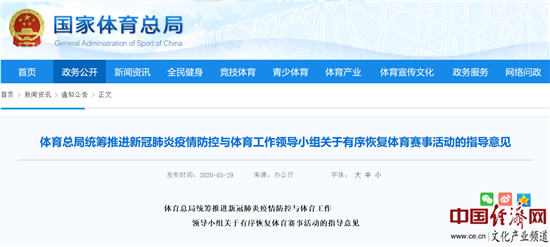 經(jīng)濟日報-中國經(jīng)濟網(wǎng)北京6月3日訊 近日,國家體育總局發(fā)布了《體育總局統(tǒng)籌推進新冠肺炎疫情防控與體育工作領(lǐng)導小組關(guān)于有序恢復體育賽事活動的指導意見》(以下簡稱“意見”),意見指出,采取預(yù)約、限流等方式,有序開放各類運動場所。 >>>更多政策可查看中國經(jīng)濟網(wǎng)“中國文化產(chǎn)業(yè)政策庫”