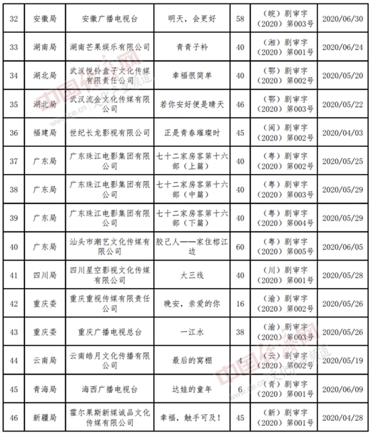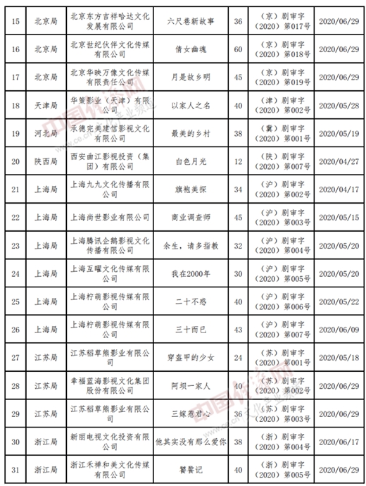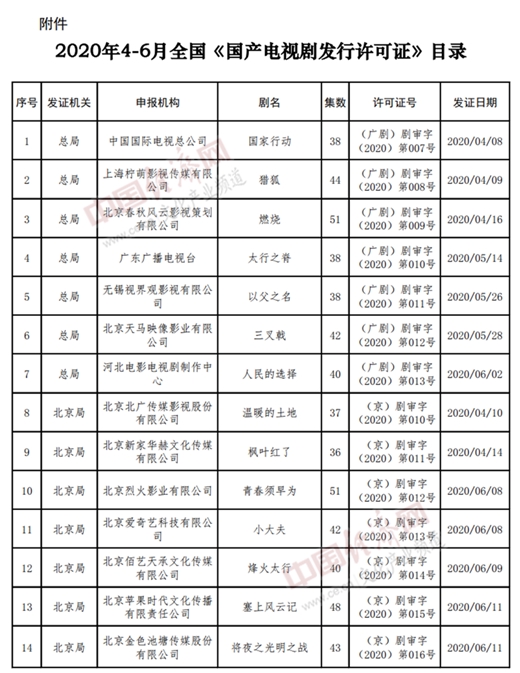 以下為2020年4至6月全國《國產電視劇發(fā)行許可證》目錄: