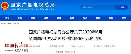 經(jīng)濟(jì)日?qǐng)?bào)-中國(guó)經(jīng)濟(jì)網(wǎng)北京8月5日訊 中國(guó)經(jīng)濟(jì)網(wǎng)文化產(chǎn)業(yè)頻道記者從國(guó)家廣播電視總局官網(wǎng)獲悉,《國(guó)家廣播電視總局辦公廳關(guān)于2020年6月全國(guó)國(guó)產(chǎn)電視動(dòng)畫(huà)片制作備案公示的通知》(簡(jiǎn)稱(chēng)《通知》)于4日發(fā)布?!锻ㄖ访鞔_,2020年6月,經(jīng)備案公示的全國(guó)國(guó)產(chǎn)電視動(dòng)畫(huà)片為53部,19934分鐘。