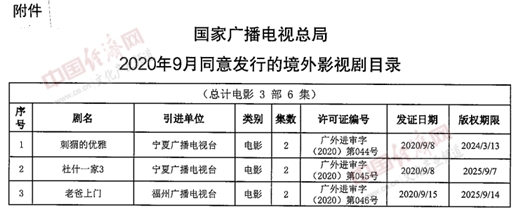 經(jīng)濟(jì)日?qǐng)?bào)-中國(guó)經(jīng)濟(jì)網(wǎng)北京10月27日訊 26日,國(guó)家廣播電視總局辦公廳公布2020年9月全國(guó)引進(jìn)境外影視劇有關(guān)情況,由寧夏廣播電視臺(tái)引進(jìn)的《刺猬的優(yōu)雅》《杜什一家3》,福州廣播電視臺(tái)引進(jìn)的《老爸上門》等3部電影,入選《2020年9月同意發(fā)行的境外影視劇目錄》。