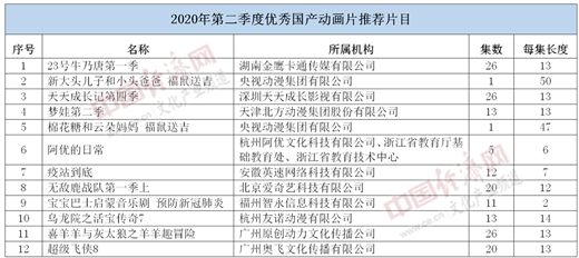 據(jù)經(jīng)濟(jì)日?qǐng)?bào)-中國(guó)經(jīng)濟(jì)網(wǎng)記者了解,此次入選的國(guó)產(chǎn)動(dòng)畫(huà)片集數(shù)最長(zhǎng)26集,最短1集。根據(jù)相關(guān)通知,入選2020年第二季度優(yōu)秀國(guó)產(chǎn)動(dòng)畫(huà)片推薦片目的12部作品將優(yōu)先安排在全國(guó)各級(jí)電視臺(tái)上星綜合頻道、動(dòng)畫(huà)少兒頻道、地面少兒頻道播出。