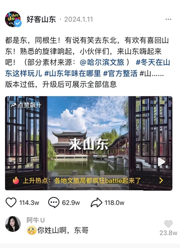 在一些平臺上,河南文旅答題送鉆石;張家界文旅局長跳“科目三”;齊齊哈爾請了演員沈騰發(fā)布視頻,“邀請各地王子公主到齊齊哈爾”;河北文旅也和演員趙麗穎在網(wǎng)上互動,趙麗穎直呼“我為河北文旅扛大旗”;沈陽的文旅局局長還注冊了社交平臺賬號,并迅速解決網(wǎng)友反映的旅游痛點(diǎn)……不僅如此,還有的地方文旅直接免景區(qū)門票,推出優(yōu)惠大禮包,“真金白銀”吸引客源。