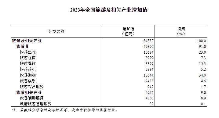 從內(nèi)部構(gòu)成看,旅游業(yè)增加值為49890億元,占旅游及相關(guān)產(chǎn)業(yè)增加值比重為91.0%,比上年提高1.7個(gè)百分點(diǎn)。旅游相關(guān)產(chǎn)業(yè)增加值為4942億元,占旅游及相關(guān)產(chǎn)業(yè)增加值比重為9.0%,比上年下降1.7個(gè)百分點(diǎn)?!?/p>