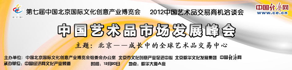 目前,北京藝術(shù)品市場(chǎng)在全球格局中將處于怎樣的定位?藝術(shù)品的稅收問(wèn)題如何解決?中國(guó)藝術(shù)品經(jīng)營(yíng)及研究機(jī)構(gòu)面臨哪些機(jī)遇和挑戰(zhàn)?文化保稅區(qū)的政策優(yōu)勢(shì)如何能促進(jìn)北京藝術(shù)品交易市場(chǎng)的發(fā)展?作為2012第七屆中國(guó)北京國(guó)際文化創(chuàng)意產(chǎn)業(yè)博覽會(huì)重要的活動(dòng)之一,由北京文化創(chuàng)意產(chǎn)業(yè)促進(jìn)中心、北京歌華文化發(fā)展集團(tuán)和中國(guó)經(jīng)濟(jì)網(wǎng)共同主辦,中國(guó)經(jīng)濟(jì)網(wǎng)文化產(chǎn)業(yè)頻道承辦的“2012中國(guó)藝術(shù)品市場(chǎng)發(fā)展峰會(huì)”將于12月在北京舉行,特邀請(qǐng)政府相關(guān)部門及各方人士針對(duì)目前北京藝術(shù)品市場(chǎng)發(fā)展現(xiàn)狀和發(fā)展趨勢(shì)進(jìn)行直接的交流對(duì)話。