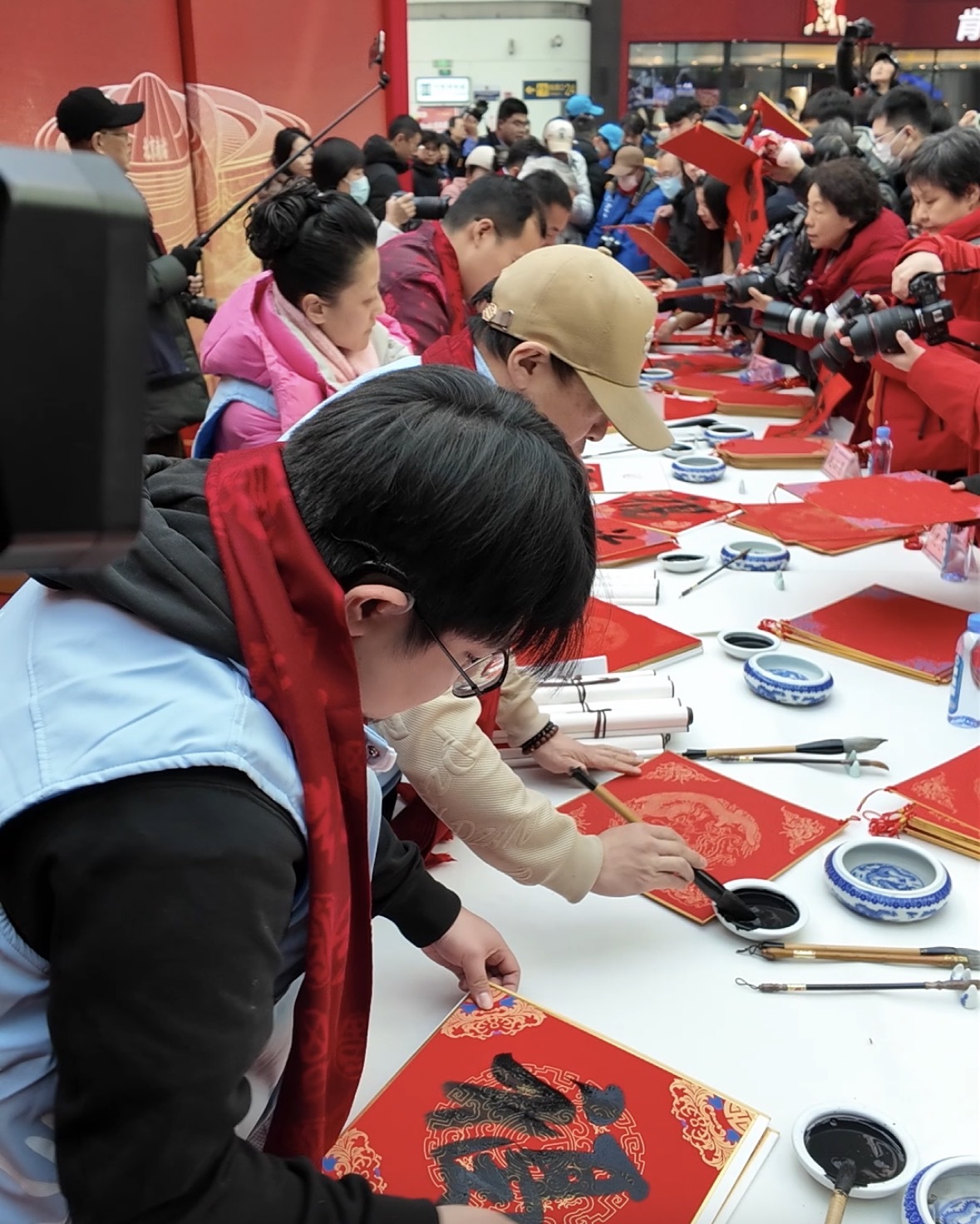 “旅途賀新春、溫暖回家路”春運(yùn)送溫暖文明實(shí)踐活動(dòng)在北京南站候車大廳上演。書(shū)法家們?yōu)槁每蜁?shū)寫(xiě)福字。中國(guó)經(jīng)濟(jì)網(wǎng)記者鞠然/攝