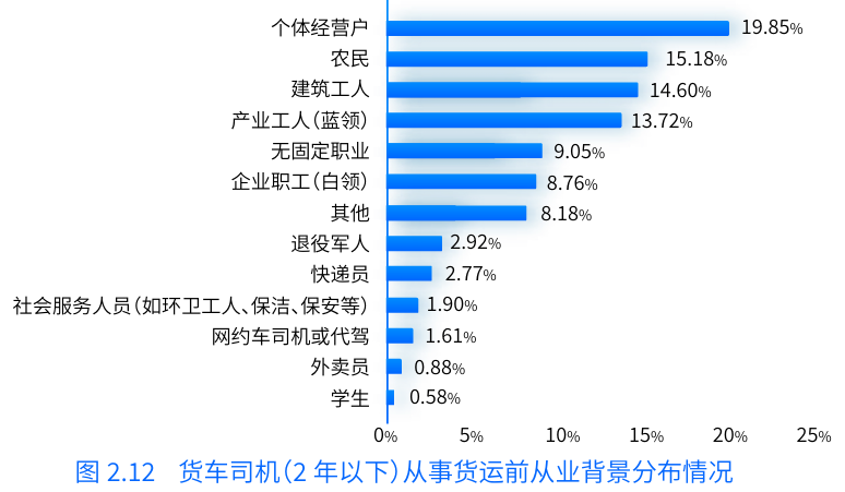不僅如此,報(bào)告中還提到,過往貨運(yùn)行業(yè)對(duì)傳統(tǒng)行業(yè)從業(yè)者的吸引力較強(qiáng),多為農(nóng)民、個(gè)體經(jīng)營(yíng)戶、產(chǎn)業(yè)工人(藍(lán)領(lǐng))、無固定職業(yè)、建筑工人等群體。而近幾年,轉(zhuǎn)型從事貨車司機(jī)的職業(yè)還包含了企業(yè)職工(白領(lǐng))、社會(huì)服務(wù)人員、學(xué)生等,另外,外賣員、快遞員、網(wǎng)約車司機(jī)及代駕司機(jī)等新型靈活就業(yè)者也有部分人群選擇轉(zhuǎn)行成為貨車司機(jī)。