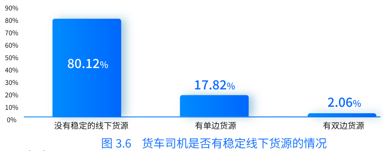 報(bào)告中提到,約80.12%的司機(jī)沒有穩(wěn)定的線下貨源供應(yīng),貨車司機(jī)很少能夠掌握穩(wěn)定線下貨源。大部分司機(jī)面臨貨運(yùn)工作的不穩(wěn)定性,需要花費(fèi)大量時(shí)間和精力去尋找和獲取貨源,這不僅降低了他們的運(yùn)輸效率,也增加了運(yùn)營(yíng)成本。