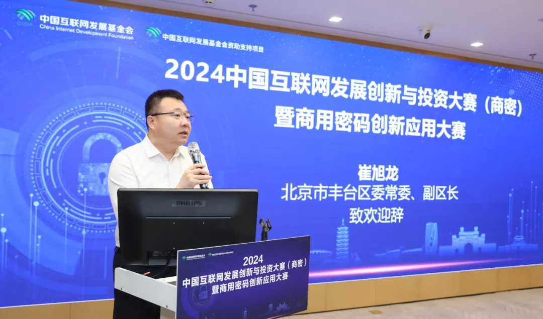 北京市豐臺(tái)區(qū)常委、副區(qū)長(zhǎng)崔旭龍致辭,中國(guó)互聯(lián)網(wǎng)發(fā)展基金會(huì)、中國(guó)互聯(lián)網(wǎng)投資基金、工信部網(wǎng)安中心領(lǐng)導(dǎo)出席觀賽。