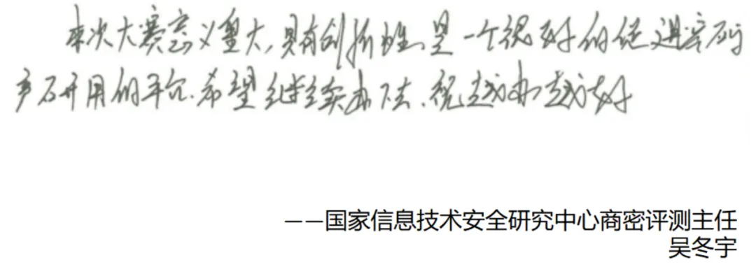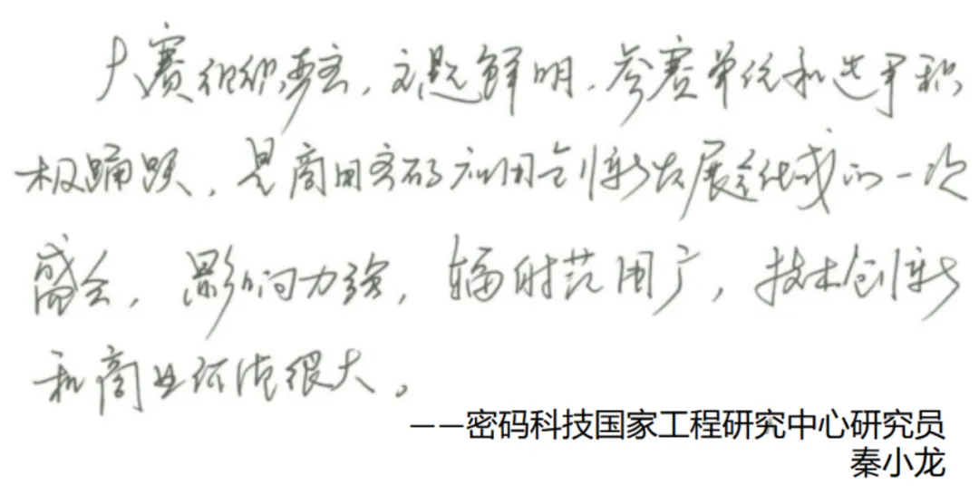 賽后,密碼科技國(guó)家工程研究中心研究員秦小龍、中國(guó)電力科學(xué)研究院高級(jí)工程師李智虎、中國(guó)科學(xué)院大學(xué)網(wǎng)絡(luò)空間安全學(xué)院教授/博導(dǎo)王躍武、國(guó)家信息技術(shù)安全研究中心商密評(píng)測(cè)主任吳冬宇等多位專(zhuān)家評(píng)委給大賽提出了寶貴的建議和意見(jiàn)。