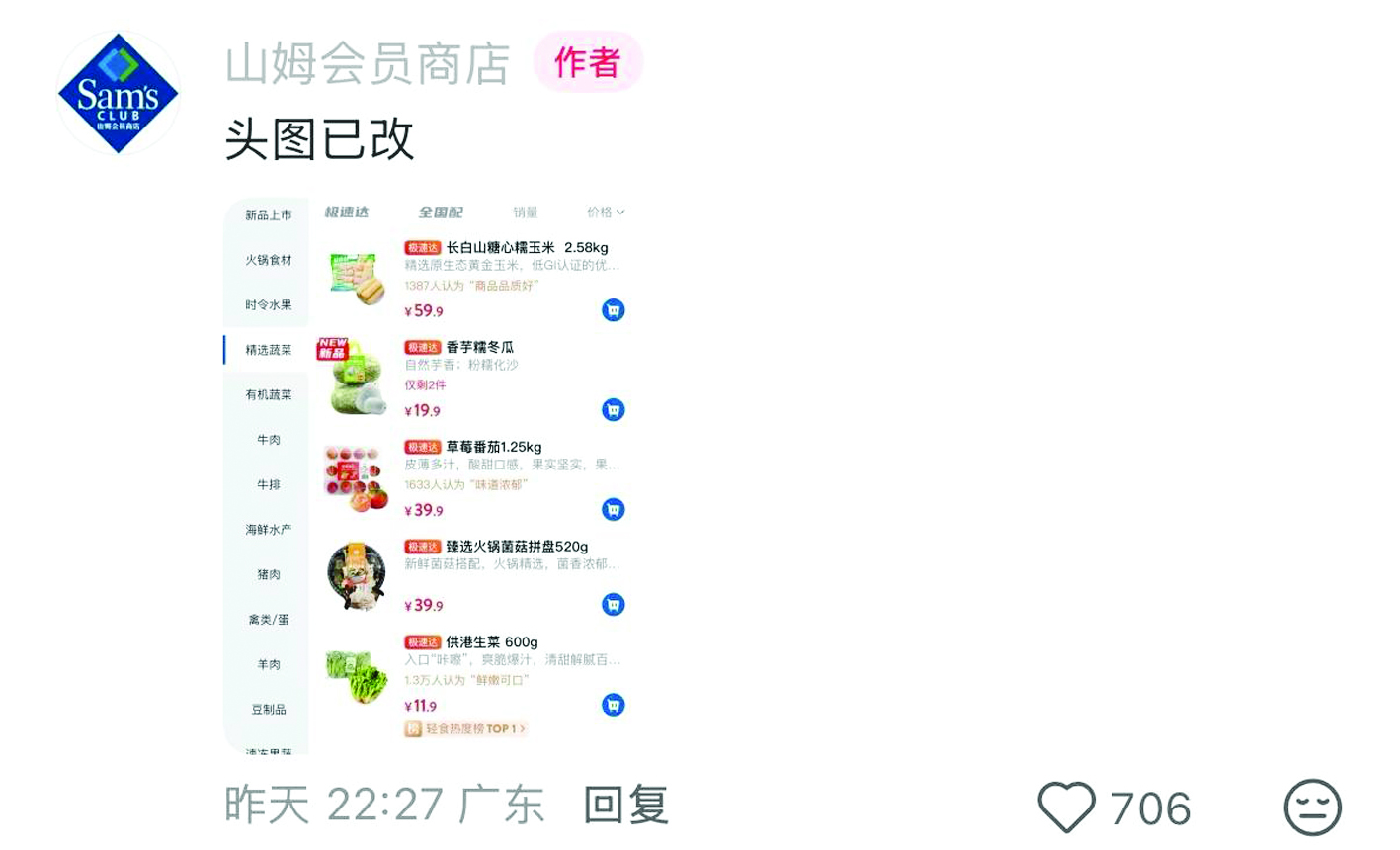 “本次APP的改動于今年8月底開始上線進行測試,并在期間持續(xù)根據會員的反饋進行優(yōu)化。這兩天我們陸續(xù)收到了更多來自會員關于商品圖片等方面的寶貴建議,我們將會持續(xù)改進,以更好地展現(xiàn)商品的真實形態(tài)并提升體驗。我們始終珍視會員的聲音,歡迎大家在‘山姆APP—我的—用戶調研—商品詳情頁調研’持續(xù)給予反饋。感謝大家的支持。”除此之外,山姆還在評論區(qū)配圖稱:“頭圖已改。”