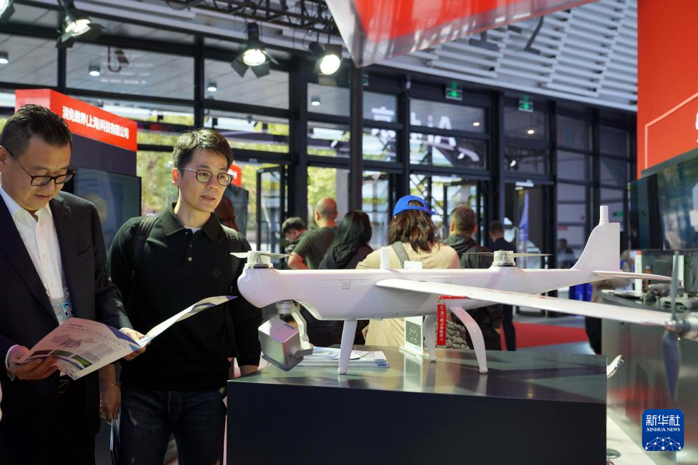 11月6日,嘉賓在觀看可提供空中巡檢服務(wù)的“道通龍魚 Pro”垂直起降固定翼。新華社記者趙宇思攝