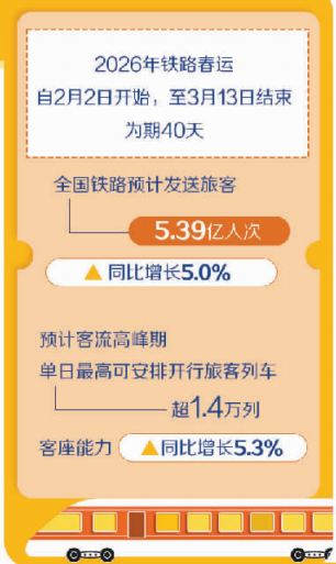 2026年鐵路春運(yùn)自2月2日開始,至3月13日結(jié)束,為期40天,全國鐵路預(yù)計(jì)發(fā)送旅客5.39億人次、同比增長(zhǎng)5.0%,節(jié)前客流高峰日預(yù)計(jì)為2月13日(農(nóng)歷臘月廿六),節(jié)后客流高峰日預(yù)計(jì)為2月23日(農(nóng)歷正月初七)。
