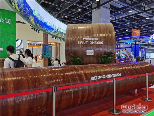 一家企業(yè)展示的竹纏繞復(fù)合材料管廊。竹纏繞復(fù)合材料低碳節(jié)能,兼具減碳、固碳、儲(chǔ)碳功能。