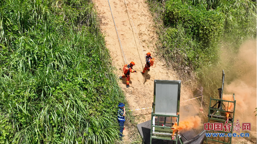 消防員在特殊地形處置煙點。特殊地形煙點處置是指在無法直接接近的陡坡設置模擬煙點(水袋),要求人員協(xié)同利用繩索技術安全抵近煙點進行處置,以輸水時間和組織的安全性綜合評定成績,檢驗特殊地形條件下滅火、救援技術結(jié)合運用的能力。 李為展/攝