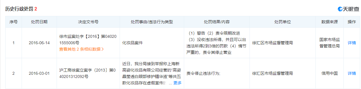 據(jù)天眼查,上海新高姿化妝品有限公司曾有兩次歷史行政處罰記錄,一次因添加了未經(jīng)審批的配方被警告,并沒收違法所得;一次因虛假宣傳,違反了《中華人民共和國反不正當競爭法》《上海市反不正當競爭條例》等相關(guān)法律被責令停止違法行為。
