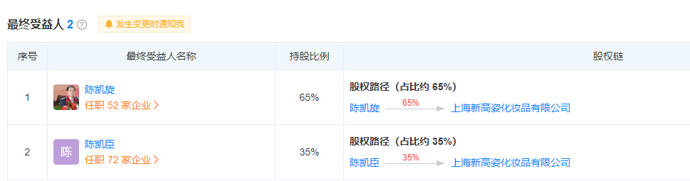 記者查詢資料顯示,上海新高姿化妝品有限公司共生產(chǎn)了800多款國產(chǎn)非特殊用途化妝品,其中包括高姿、赫拉、芊嘉、安妍雅等多個知名化妝品品牌。公司共有九個子公司,最終受益人為陳凱旋,持股占比65%。