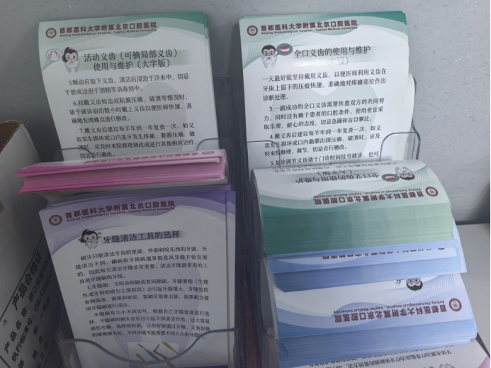 記者走進(jìn)北京口腔醫(yī)院門診樓,綠色的“老年咨詢臺(tái)”標(biāo)示映入眼簾。老年咨詢臺(tái)正前方走20米,左手邊便是老年口腔病科。順著黃色地標(biāo)徑直走約30米,便到達(dá)分診臺(tái)。上午的分診臺(tái)前,是患者最多的時(shí)候,詢問聲和指引聲交織,忙而有序。分診臺(tái)一角的老花鏡和大字版宣教彩頁(yè)引人矚目。護(hù)士告訴記者,這是為老年患者特意準(zhǔn)備的?!翱剖医ǖ臅r(shí)間長(zhǎng),我們也準(zhǔn)備搬新院了,雖然地方有點(diǎn)局促,但該有的硬件都有?!?/p>