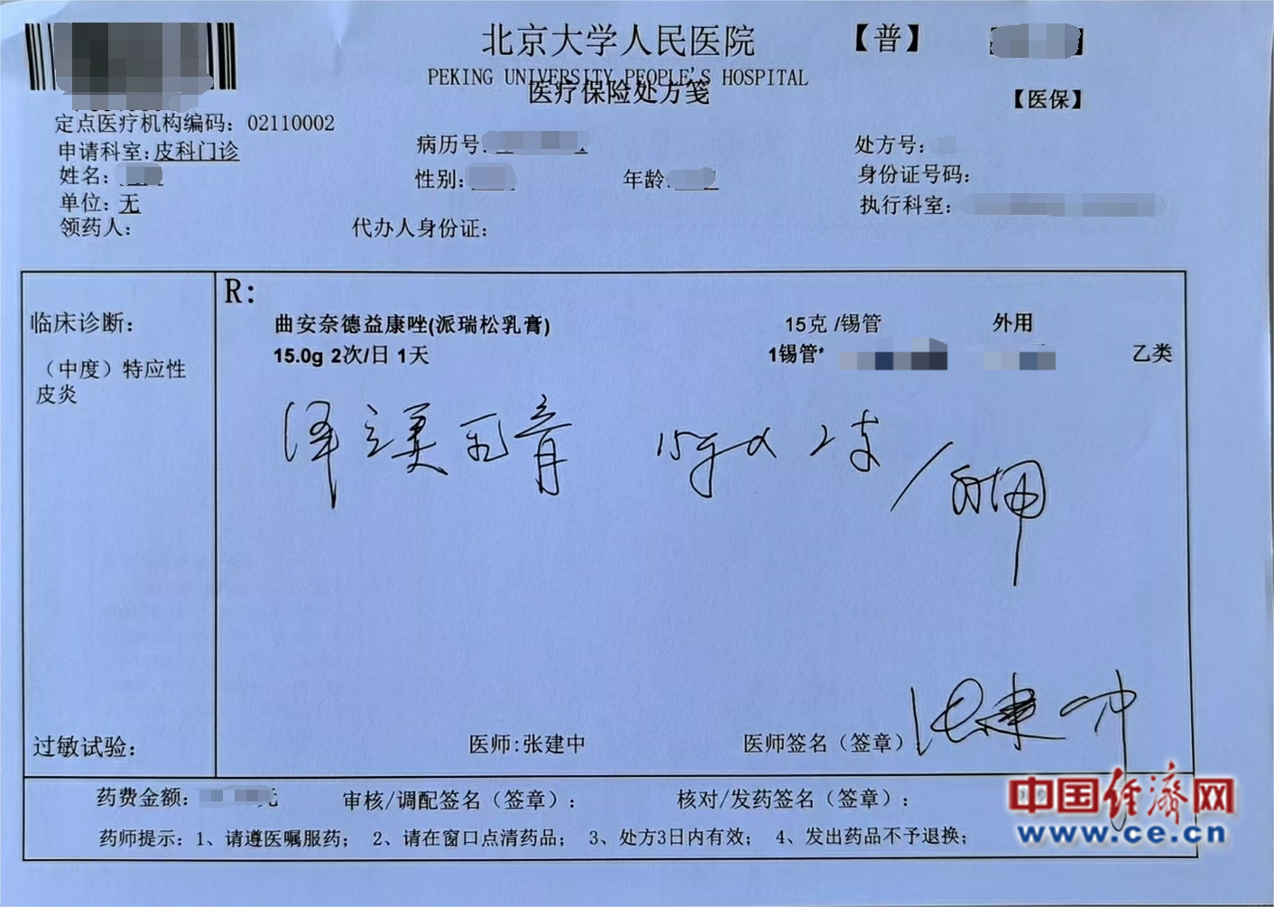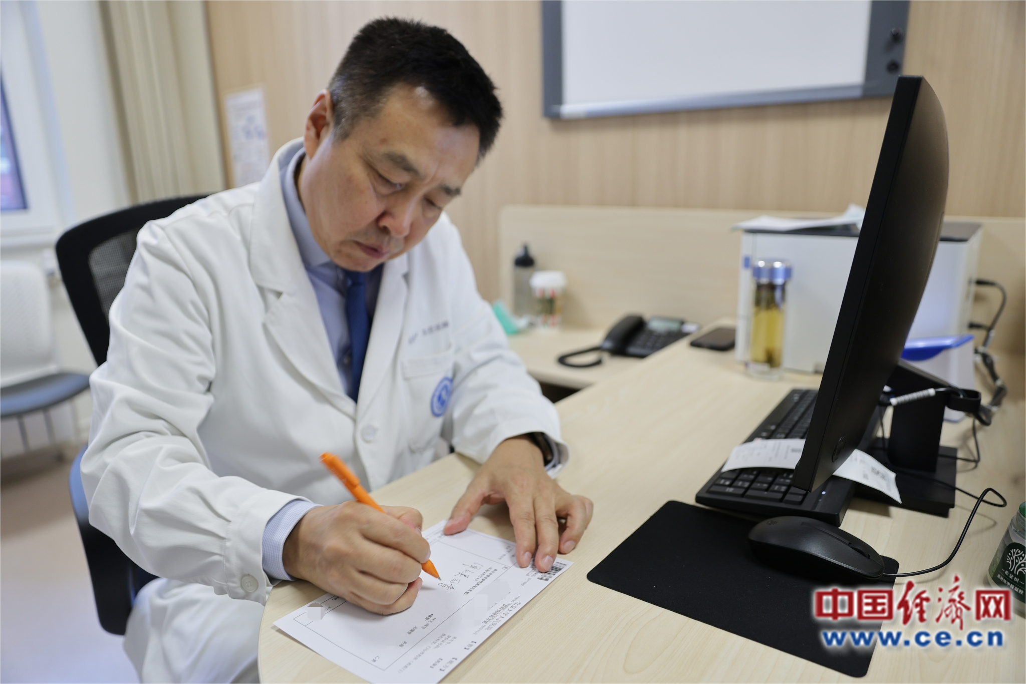 圖為北京大學人民醫(yī)院皮膚科張建中教授為患者開出首張?zhí)幏?中國經濟網裴小閣攝
