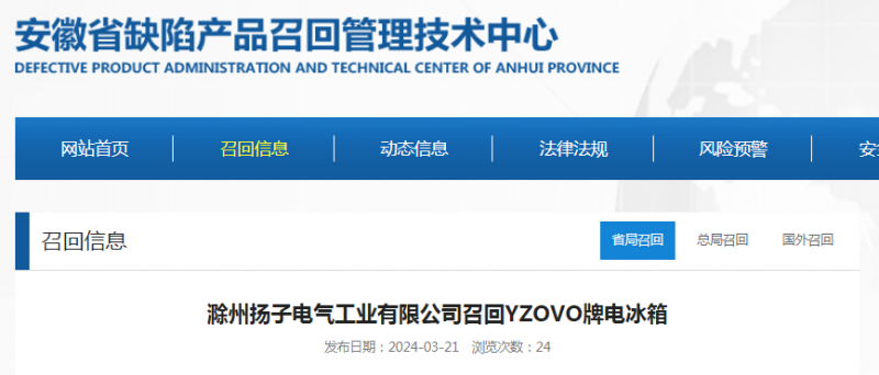 日前,滁州揚(yáng)子電氣工業(yè)有限公司按照《消費(fèi)品召回管理暫行規(guī)定》的要求,向安徽省市場(chǎng)監(jiān)督管理局、滁州市市場(chǎng)監(jiān)督管理局報(bào)告了召回計(jì)劃,將自即日起,召回2023年8月21日至2023年10月7日期間生產(chǎn)的YZOVO牌電冰箱(BCD-72P148),涉及數(shù)量為50臺(tái)。