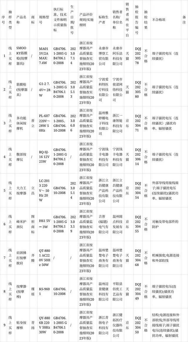 本次抽查了43批次按摩器具產(chǎn)品,其中9批次產(chǎn)品不合格。不合格項(xiàng)目為對(duì)觸及帶電部件的防護(hù)、機(jī)械強(qiáng)度、結(jié)構(gòu)、電源連接和外部軟線(xiàn)、外部導(dǎo)線(xiàn)用接線(xiàn)端子、端子騷擾電壓(連續(xù)騷擾)、騷擾功率、輻射騷擾。
