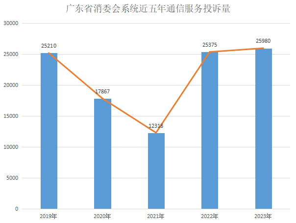 《報告》顯示,2019年至2023年,廣東省消委會系統(tǒng)共收到通信服務投訴106750件,占投訴總量的5.12%,呈現(xiàn)出先降后升的“V”字走勢。其中,前3年(2019年至2021年)相關投訴持續(xù)下降,從25210件降至12318件,平均降幅近三成。但隨著通信服務市場競爭日趨激烈、業(yè)務更加多元,2022年起通信投訴再度飆升,投訴量達25375件,同比上升106.00%,而2023年維持高位(25980件)。