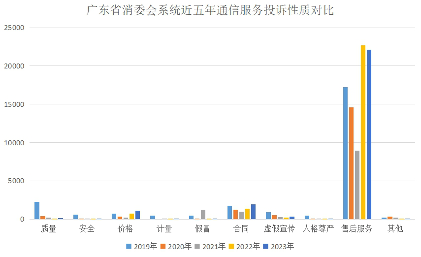 從投訴類別來看,近5年通信服務投訴95%以上集中在移動電話服務,與當前通信業(yè)發(fā)展現(xiàn)狀相符(2023年廣東固話、移動電話用戶數(shù)比例約為1:10)。從投訴性質來看,消費者反映的問題主要集中在售后服務、合同和價格3類,其中售后服務問題最為集中,占投訴總量的80.19%,是通信服務類投訴增長變化的主要因素。從地區(qū)分布來看,通信服務投訴集中在消費活躍的珠三角地區(qū),主要與經(jīng)濟發(fā)展狀況、人員密集程度相關。