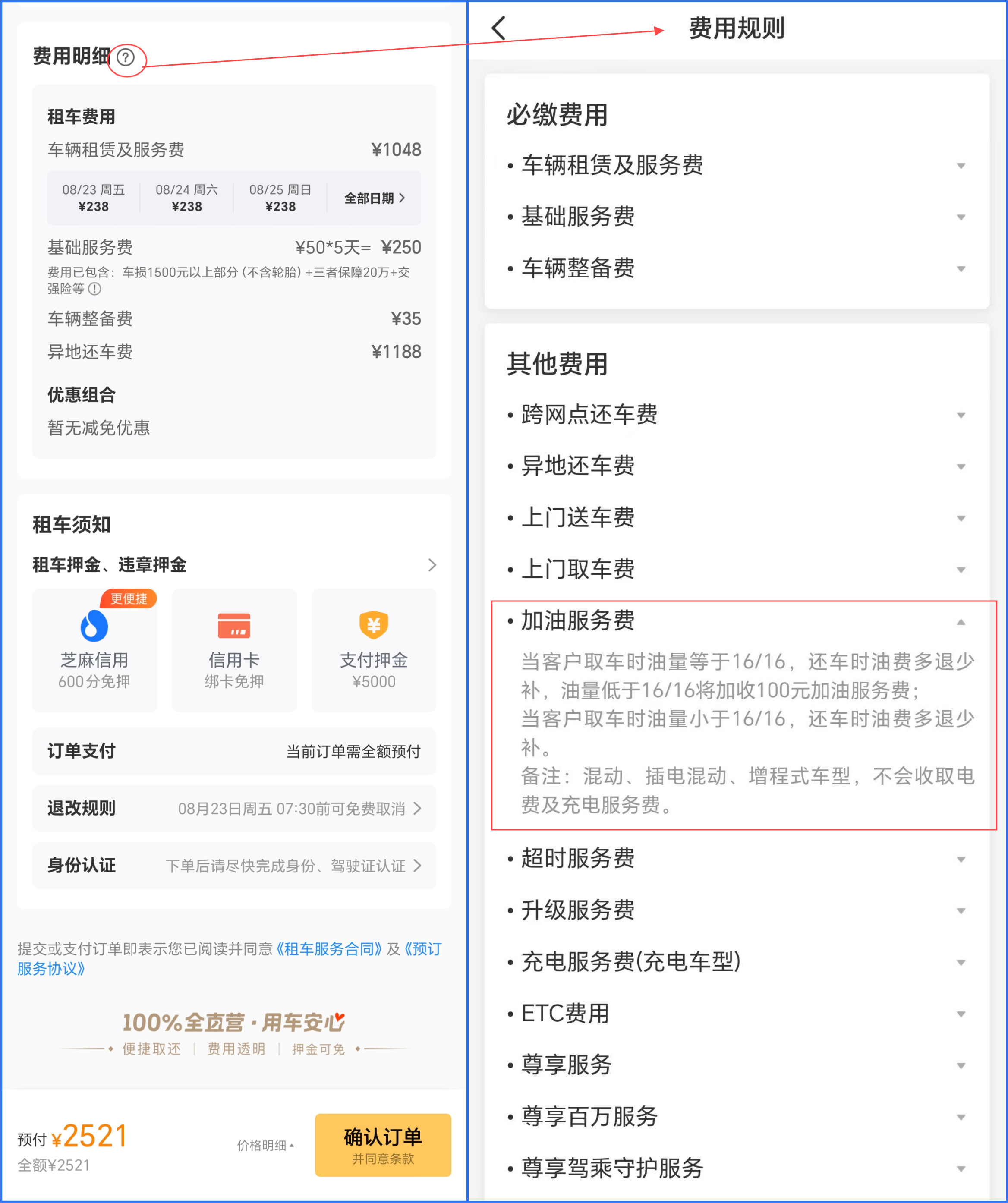 《中國消費(fèi)者報(bào)》在神州租車APP上下單租車,經(jīng)過仔細(xì)找尋,發(fā)現(xiàn)必須點(diǎn)開“費(fèi)用明細(xì)”旁邊一個(gè)不起眼的圓圈小問號(hào)圖標(biāo)后,才會(huì)跳轉(zhuǎn)至標(biāo)注著“費(fèi)用規(guī)則”的清單。在“其他費(fèi)用”一欄中包括了“加油服務(wù)費(fèi)”,點(diǎn)開后灰色小字顯示“當(dāng)客戶取車時(shí)油量等于16/16,還車時(shí)油費(fèi)多退少補(bǔ),油量低于16/16將加收100元加油服務(wù)費(fèi)”。