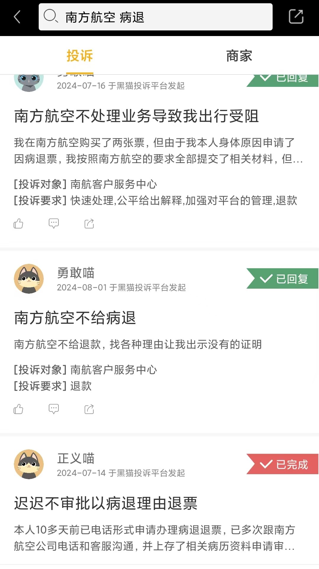 投訴平臺(tái)上有關(guān)南航病退的投訴。 資料圖片