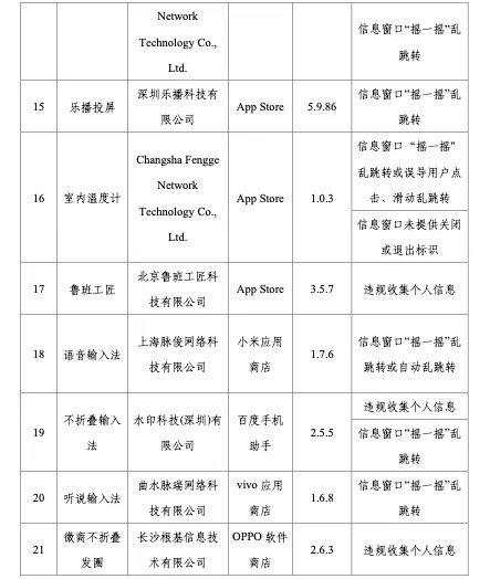 工信部稱,依據(jù)《個人信息保護(hù)法》《網(wǎng)絡(luò)安全法》《電信條例》《電信和互聯(lián)網(wǎng)用戶個人信息保護(hù)規(guī)定》等法律法規(guī),工信部持續(xù)整治APP侵害用戶權(quán)益的違規(guī)行為,在近期組織的第三方檢測機(jī)構(gòu)進(jìn)行抽查中,共發(fā)現(xiàn)27款A(yù)PP及SDK存在侵害用戶權(quán)益行為。侵權(quán)方式包括信息窗口“搖一搖”亂跳轉(zhuǎn)或誤導(dǎo)用戶滑動亂跳轉(zhuǎn)、違規(guī)收集個人信息、APP頻繁自啟動和關(guān)聯(lián)啟動、信息窗口未提供關(guān)閉或退出標(biāo)識、強(qiáng)制用戶使用定向推送功能、SDK信息公示不到位以及強(qiáng)制、頻繁、過度索取權(quán)限等,涉及小米商店語音輸入法、vivo應(yīng)用商店的聽說輸入法、App Stroe的樂播投屏等。