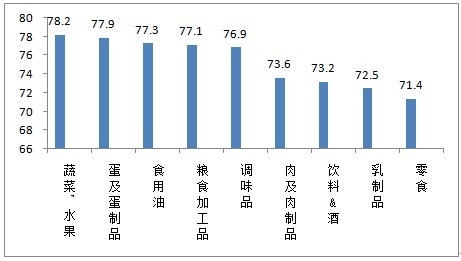 從未來發(fā)展趨勢來看,市民對蔬菜、水果的信心評價指數(shù)最高為78.2,其次是蛋及蛋制品為77.9,未來信心偏低的依然是零食、乳制品、飲料&酒和肉及肉制品。