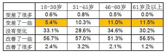 總體來看,所有年齡段市民對過去一年食品安全狀況的變化還是基本持肯定態(tài)度,但是相對于其他年齡段,46-60歲的市民對食品安全狀況變差的評價較多。