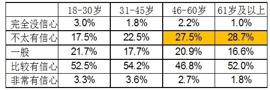 46歲以上年齡較大的市民對目前的食品安全比較擔(dān)憂,尤其是46-60歲的市民中,不太有信心的市民近三成,而比較有信心的市民僅為46.8%,遠低于18-30歲的52.5%和31-45歲的54.2%。