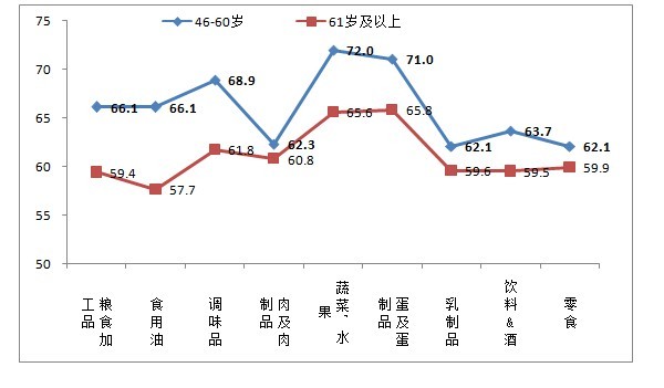 進一步分析46歲以上市民對食品安全現(xiàn)狀擔(dān)憂的食品領(lǐng)域,46-60歲市民對肉及肉制品、乳制品、飲料&酒和零食的安全信心指數(shù)評價較低,直接拉低他們目前對食品安全的放心程度。61歲以上市民目前對九大類食品的安全信心指數(shù)都偏低,除蔬菜水果和蛋及蛋制品外,其它食品的信心指數(shù)都低于65。