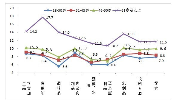 雖然年齡較大的市民對目前以及未來的食品安全信心比較不樂觀,但是他們對于九大類食品未來安全信心指數(shù)的增長抱有很大的期望,尤其是61歲以上的市民,其中他們對食用油、糧食加工品、調(diào)味品和乳制品的信心增長最為樂觀。