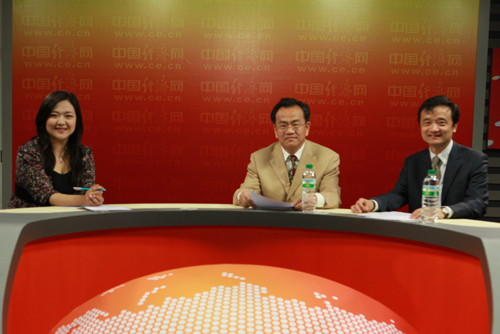 經(jīng)濟(jì)日報(bào)社產(chǎn)經(jīng)新聞部主任崔書文(中)和國家統(tǒng)計(jì)局中國經(jīng)濟(jì)景氣監(jiān)測中心副主任、高級統(tǒng)計(jì)師潘建成(右)今日做客中國經(jīng)濟(jì)網(wǎng) 王耀峰/攝
