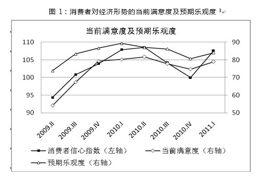 2011年一季度中國消費者信心指數(shù)為108,比2010年四季度大幅上升8點,接近近兩年高點。消費者對當前經(jīng)濟形勢的滿意度和對未來經(jīng)濟走勢的預(yù)期樂觀度均明顯上升,持樂觀態(tài)度的消費者比重均接近兩年內(nèi)的最高點。