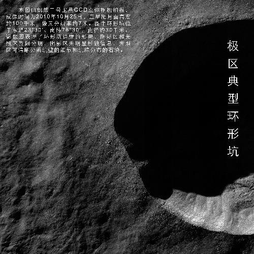 北京,2010年11月8日 國(guó)家國(guó)防科技工業(yè)局首次發(fā)布嫦娥二號(hào)月面虹灣局部影像圖 這是極區(qū)典型環(huán)形坑(成像時(shí)間為10月25日)。