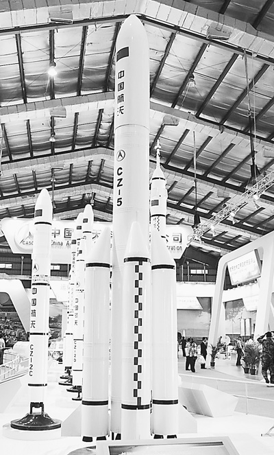 長征五號運載火箭模型。長征五號系列運載火箭是我國新一代大型運載火箭。以CZ—5E為例,其為兩級狀態(tài)火箭,芯級直徑5米,捆綁 4個3.35米直徑的助推器,起飛質量856噸,計劃2014年實現(xiàn)首飛。CZ—5E火箭已初步被確定為用于月球表面采樣和返回任務用火箭。